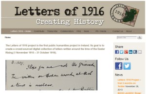 Quoting from the website’s home page – “The Letters of 1916 project is the first public humanities project in Ireland. Its goal is to create a crowd-sourced digital collection of letters written around the time of the Easter Rising (1 November 1915-31 October 1916).” In the first two months of the project over 500 letters were uploaded from both national institutions and private collections. The Letters 1916 team is identifying, digitizing and preparing hundreds more for uploading.