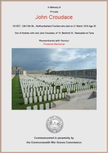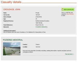 The soldier I actually need is John Croudace. The results shown are in a standardized format. What you hope and pray for is data in the Additional Information field for without it you may or may not be able to positively identify your serviceman or woman. In this case we learn that John Croudace is the son of John and Jane Croudace, of 14 Bentinck Street in Newcastle-on-Tyne. I have John with his parents (A.J. – Andrew John and Jane Croudace) and siblings at this address in the 1911 census. I have my serviceman.