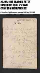 The majority of the wills, especially those from WWI were the page(s) removed from the soldiers Pay Book (Army Book 64), or an equivalent Army form. Other documents might include personal letters from soldiers, a testimony by witnesses, both of which could be accepted in lieu of a will. The majority of the wills were written by men below the rank of officers, who were domiciled in Scotland. The example is for Peter Trainer of the Queen’s Own Highlanders who died 25 Apr 1918 leaving everything to his father Robert Trainer of 88 Gloucester Str, Glasgow. The will is one of four images in the file, which is common, the other images being of the army’s sheet for the will, plus two envelopes (inner and outer).
