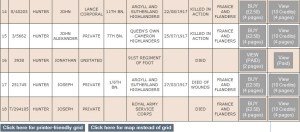 In our results table you will see Jonathan Hunter, rank unstated, of the 91st Regiment of Foot, who died, with no date or place given. We know that regimental numbers were no longer being used by WWI, so we can safely guess that this is a pre-WWI soldier. That however is still a potentially big time period 1857-1914. So how can we narrow down our options to see if it is worth spending the money on getting the will?