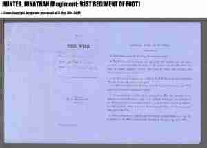 The will on Form of Will, No.1 states “to be used by a Soldier desirous of leaving the whole of his Effects to one person. Jonathan Hunter No. 3930, of the 91st Regiment of Foot, do hereby revoke all former Wills by me made, and declare this to be my last Will. After payment of my just Debts and Funeral expenses, I give to my wife, Isabella Hunter of No. 5 Waterton Street, Mile End, Glasgow, absolutely for her sole and separate use, her receipt being a sufficient discharge; the whole of my Estate and Effects, and everything that I can by law give or dispose of.” The will is then duly signed by three witnesses.