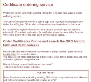 Urgency – What is time sensitive here is that on November 9th the General Register Office started offering digital copies of the birth and death certificates, in these periods only, for a reduced price of 6 Pounds (US$7.45), as opposed to the regular price of 9 Pounds 25 Pence (US$11.49) for the paper copies. This a trial offer and is only available for 3 weeks or 45,000 pdfs, whichever comes first. It will probably be the number of certificates as this is a bargain. So do your searches now. What the government will choose to do after this is a complete unknown. I personally ordered 4 certificates yesterday on the first day and have ordered another 10 this morning. I will be ordering more.