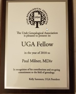 Paul Milner was the latest recipient of the UGA Fellow Award. Paul is a native of northern England. After the death of his father in 1980, he started researching his family history and turned professional in 1993. Part of his business plan was to be speaking nationally within five years. This goal was accomplished in 1996 when he spoke at his first FGS conference in Rochester, NY. He has spoken at one or both national conferences ever since as well as speaking widely at societies across the United States.