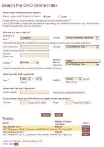 GRO – General Register Office birth search Screen for Callaghan – Hagan children